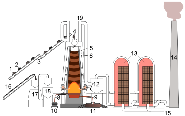 Внутри доменной печи кокс сгорает в струе горячего воздуха, образуя оксид углерода; Этот газ восстанавливает железо из руды, постепенно опускаясь вниз по печи. Температура в нижней части печи достигает 2000°C.