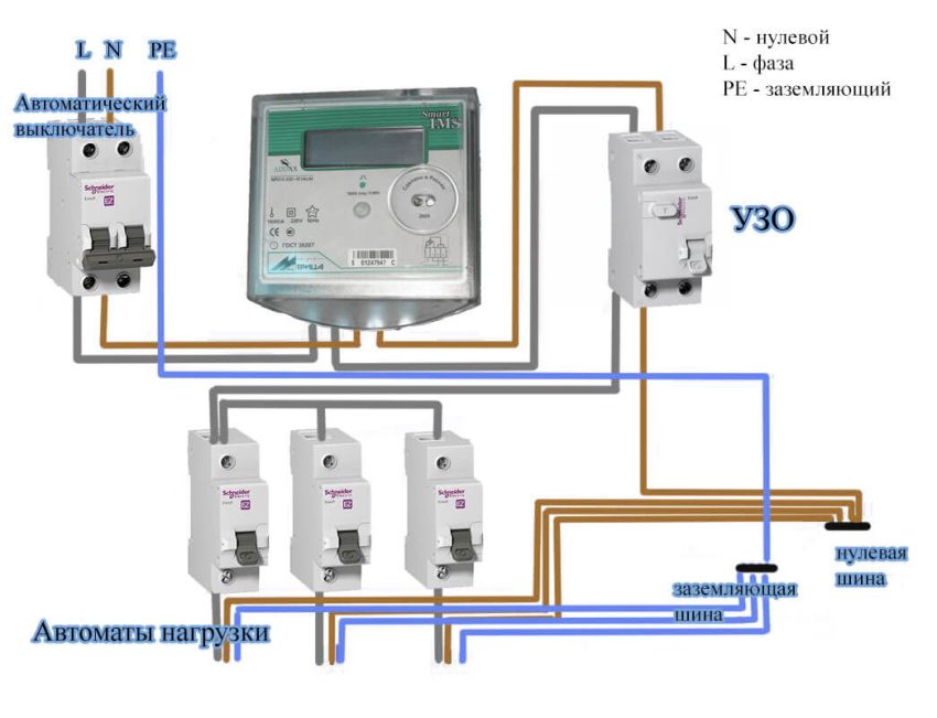 - Выход фазы и нуля со счетчика подключается к УЗО или дифавтомату.